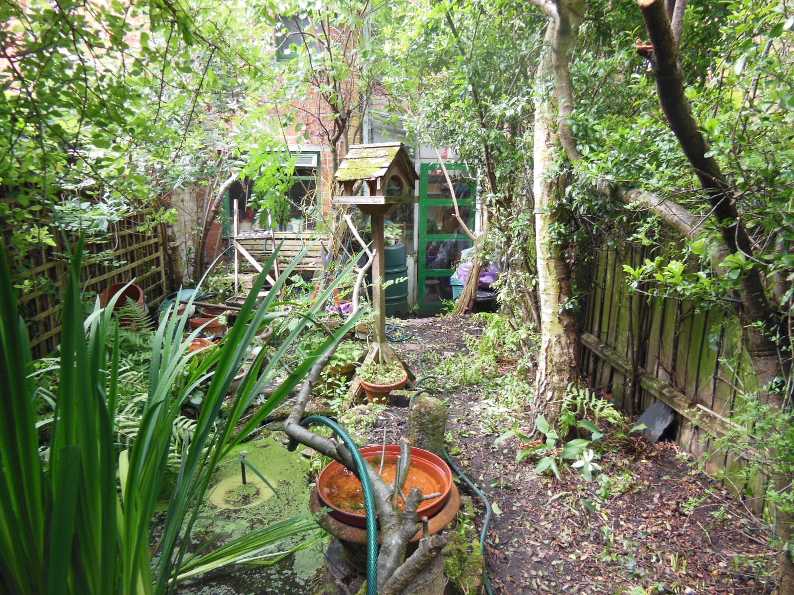 Unfortunately the plants in the garden cottoned onto this, and entered into an anti-DB alliance, and made a bid to take over the house as well. They destroyed part of the garden fence, overgrew the conservatory, blocked the kitchen window, and tried to grow into the bathroom window. Most of the attack was spearheaded by the pyracanthia pricker bushes. They also grew into the garden path, so I could no longer reach the compost heap, or tend to the pond, never mind using the washing line to hang up laundry.