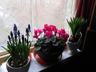 Here it goes. Ever since I spent time in Holland in my youth I fondly remembered the windows of a bed & breakfast in Hillegom near the Keukenhof. It was an old house, and had huge window sills. There were no curtains, instead the window sills were filled with blooming bulbs, and there were even hanging baskets suspended from the top of the window, also filled with blooming potted plants. The result was enchanting, hyacinths, daffodils, tulips, grape hyacinths, and any other flower that could be forced from a bulb in mid-winter, all jostled for space on those huge magic window sills.